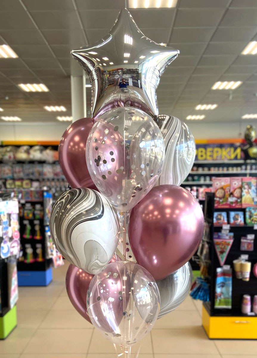 Букет Ассорти из шаров хром-агат Звезда розовый-серебро №2 10 шт