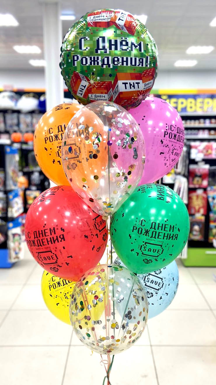 Шар Круг фольга С ДР Пиксели 46 см 1 штШар латексный Кристалл прозрачный + конфетти разноцветное 3 шт