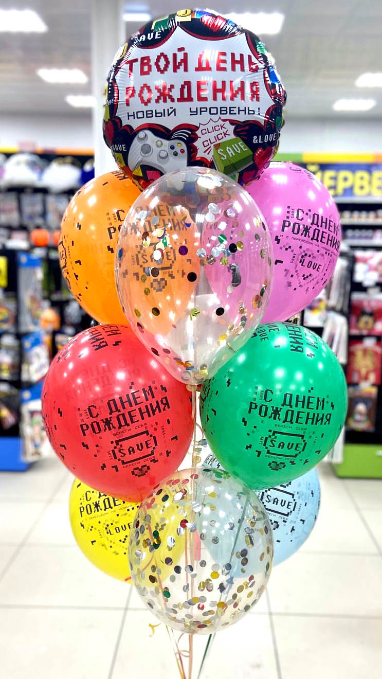 Шар Круг фольга Твой День рождения Пиксели 46 см 1 штШар латексный Кристалл прозрачный + конфетти разноцветное 3 шт